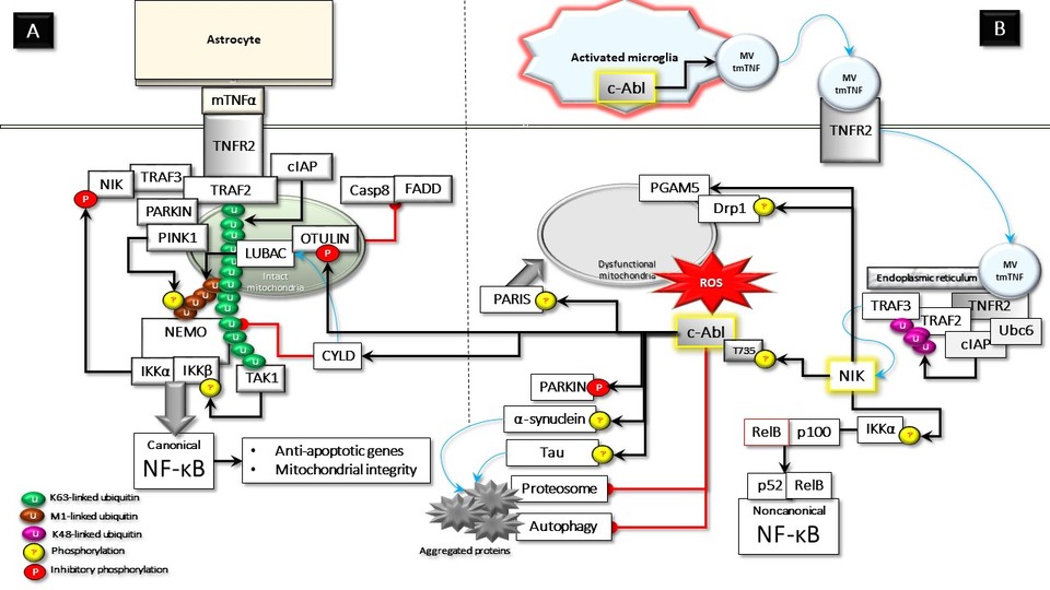 Figure 1. Opposed neuronal functions of TNFR2 reminiscent of Dr. Jekyll and Mr. Hyde. (A) In the resting state, TNFR2, activated by paracrine mTNF, interacts with TRAF2, which is complex with TRAF3-NIK and c-IAP. TRAF2 is also associated with Parkin/PINK1 on the mitochondrial outer membrane. cIAP ubiquitinates TRAF2 by K63-linked ubiquitin chains, which stimulates the recruitment of LUBAC-OTULIN and TAK1. LUBAC adds M1-linked ubiquitin chains, resulting in the formation of mixed K63-linked and M1-linked ubiquitin chains, which is required to recruit NEMO. Subsequent phosphorylation of NEMO- associated IKKα and IKKβ by TAK1 activates the NF-κB signaling pathway, which starts the transcription of a large number of genes, required for neuronal survival. Furthermore, the formation of the NEMO-IKKα-IKKβ complex is necessary to phosphorylate and inhibit NIK. (B). Activated microglia secretes microvesicle (MV), which contain transmembrane TNF (tmTNF). The latter interacts with TNFR2, enforcing the endocytosis of the ligand-receptor complex to the perinuclear area. Cytoplasmic TNFR2-associated TRAF2-cIAP-TRAF3-NIK meets with Ubc6 and the E2 conjugating enzyme for c-IAP at the endoplasmic membrane. cIAP ubiquitination with K48-linked ubiquitin chains promotes the degradation of TRAF2 and TRAF3, leading to NIK accumulation. NIK phosphorylates IKKα for the initiation of the noncanonical NF-κB signaling pathway. In addition, NIK phosphorylates Drp1, which facilitates Drp1-PGAM5 interaction, and thus triggers mitochondrial fission. Oxidative stress caused by mitochondrial fission or NIK itself phosphorylates c-Abl at threonine 735 (T735).Activated c-Abl phosphorylates α-synuclein and tau, stimulating their aggregate formation. Parkin's functions are inhibited by c-Abl phosphorylation. The stimulatory phosphorylation of PARIS contributes to mitochondrial abnormalities. Finally, phosphorylation of OTULIN disrupts its association with LUBAC, facilitating the interaction of CYLD and LUBAC. Black arrows for stimulation; blocked red arrows for inhibition and blue arrows for activation signals.