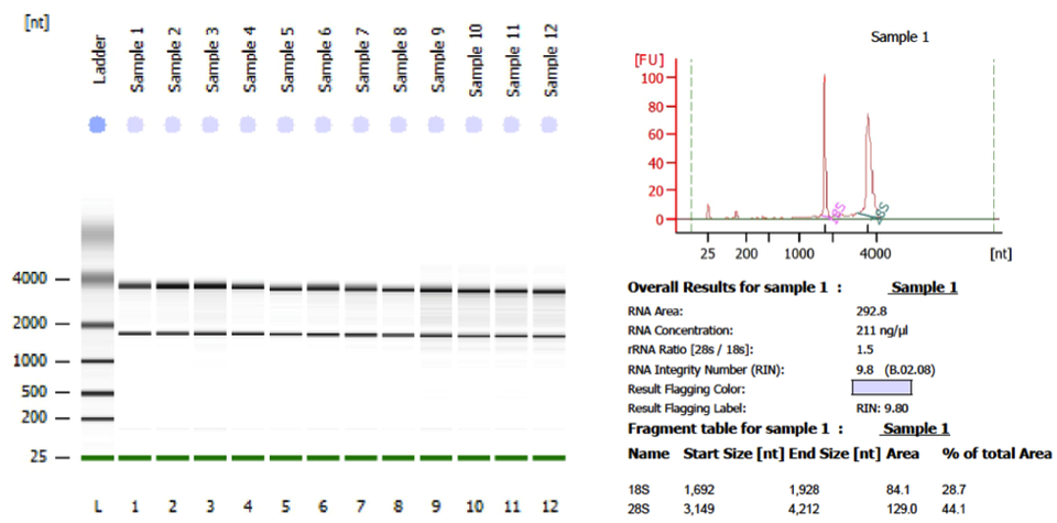 The Agilent Bioanalyzer uses a microfluidics approach to assess the quality of the RNA, but the principle is reasonable similar to that described above. Figure 4 shows some sample results.