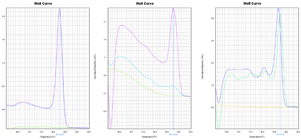 Using the qPCR machine's software, look at the melting curves for each primer pair being tested to see if there is a single temperature peak. Figure 5 shows some examples of good and bad melting curves.