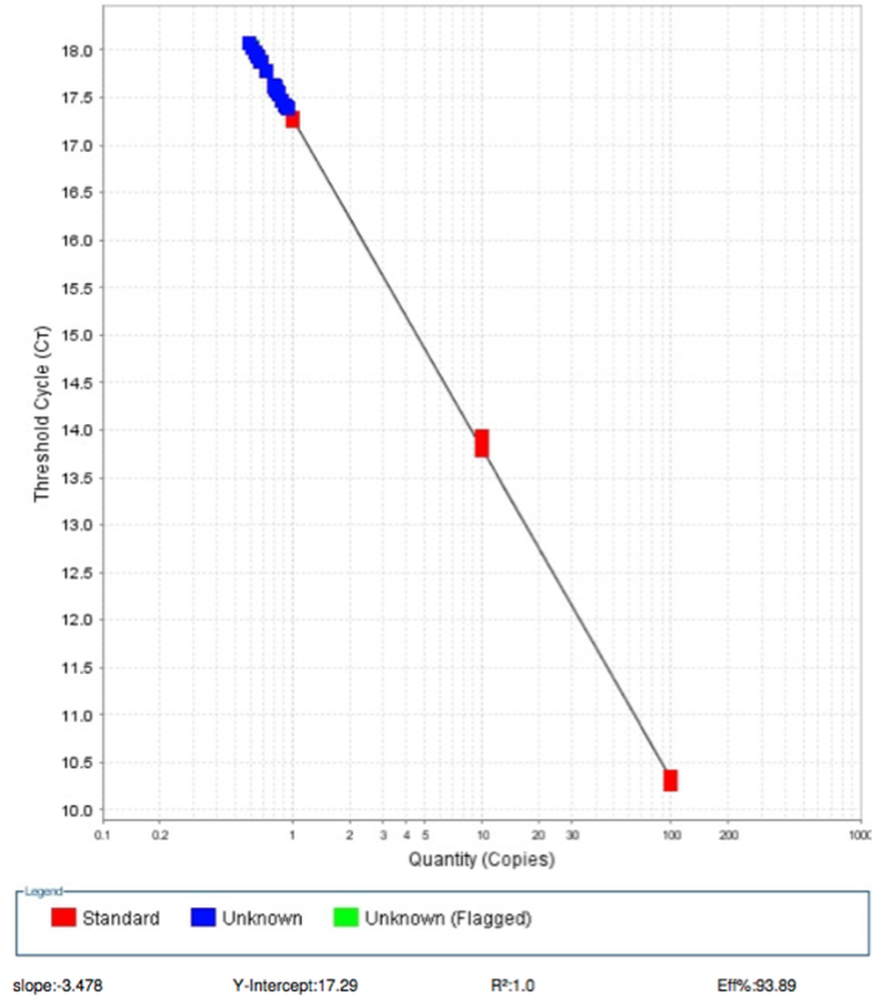 Now that you have generated your standard curve, you can test these samples using your qPCR machine. Using precisely the same procedure as in step 4, perform qPCR on your standards, each one in triplicate. Your machine may allow you to enter the true quantities (ng) of each standard, which you should know based on the nanodrop results in step 5.