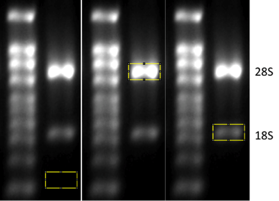 Even if your image acquisition software does not allow calculation of band intensities, you can generate fairly good 28S:18S values using ImageJ software. To do this, open your image file with ImageJ, draw a rectangular box in an empty/black area and click Analyze-Measure. This is your background value you will subtract from the 28S and 18S values. Then drag the box to the 28S band, click Analyze-Measure and then repeat for the 18S band (Figure 2).