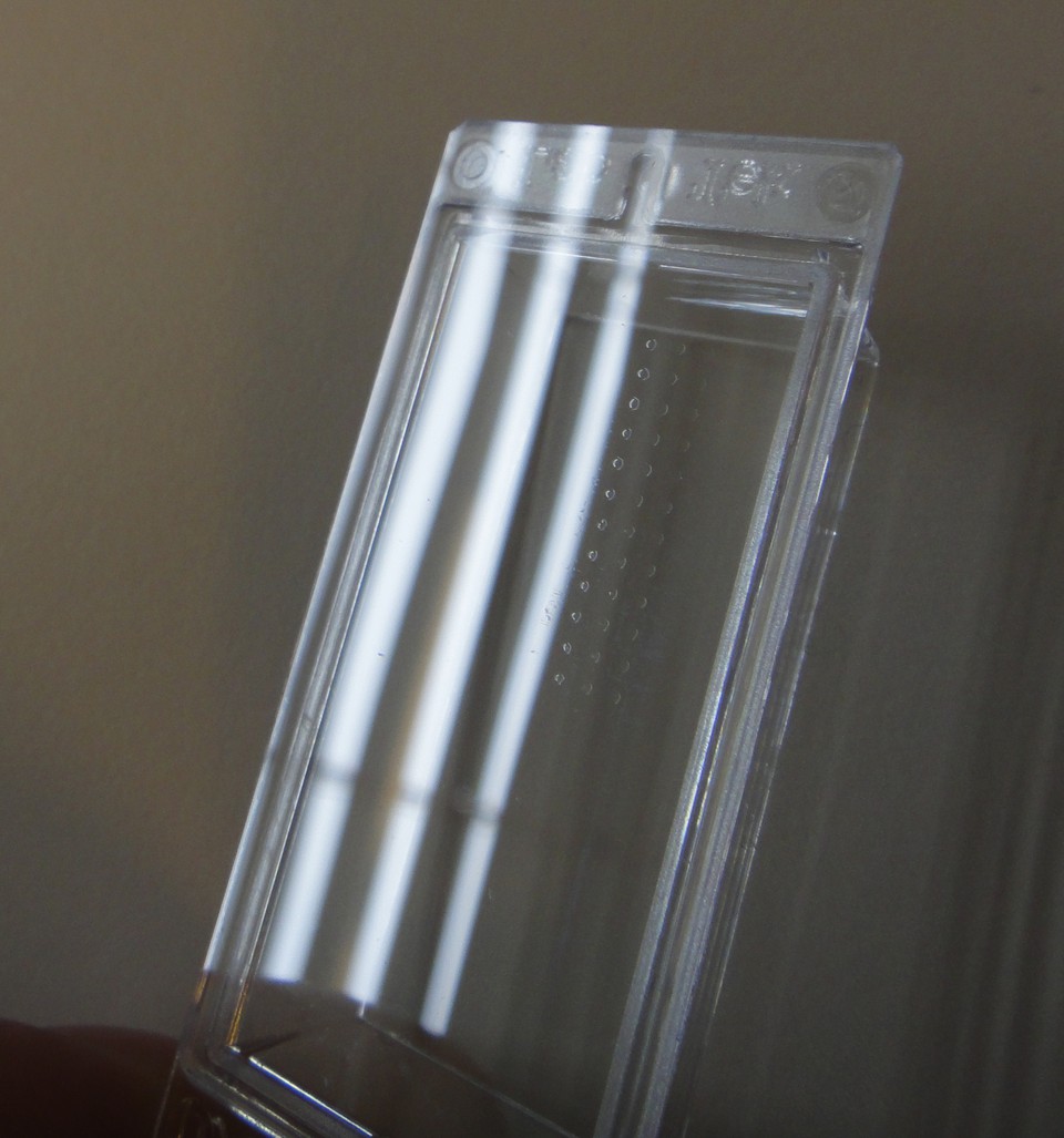 The transfection solution can now be printed on dishes (e.g. LabTek chambered coverglass) using the contact printer ChipWriter Pro (Bio-Rad). After spotting, dishes should be placed in a box containing drying pearls and stored at RT for at least 24 h before cell seeding.
