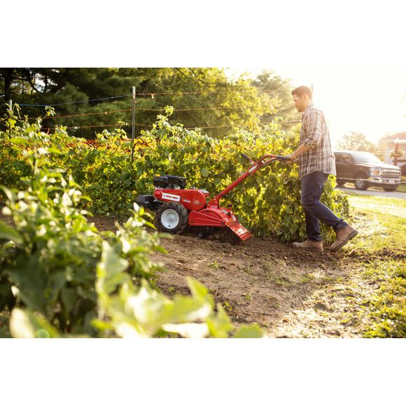 The Troy-Bilt Mustang™ dual-direction rear-tine tiller is designed to let you choose which tine direction to use based on soil conditions or garden size. Counter-rotating tines help dig into hard soil while forward-rotating tines till through softer ground and established beds quickly. An 18-inch tilling width gives a wide reach.