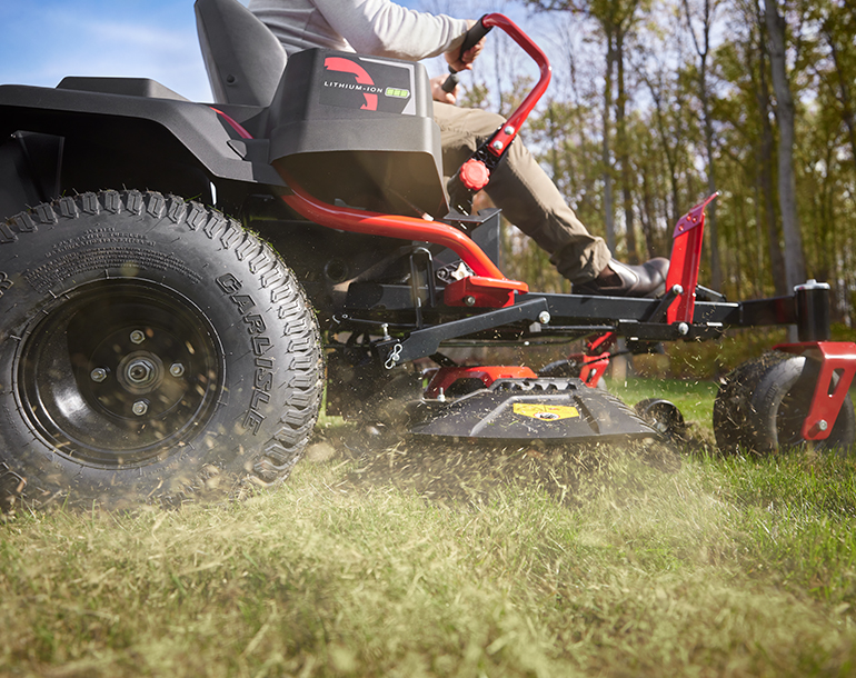 Zero-turn mowers are ideal for larger, flat to slightly hilly yards and are designed to reduce mowing time. They are usually controlled by two lap bars that independently control the speed and direction of the rear wheels. This type of drive system, combined with front caster wheels, allows zero-turn mowers the ability to execute fast turns and makes them optimal for yards with obstacles to mow around.